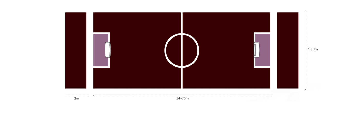 1 직사각형으로 이루어진 경기장의 크기는 단변은 7~10m, 장변은 14~20m 이어야 하되 장변과 단변의 비율은 2:1이거나 이에 가까워야 한다.