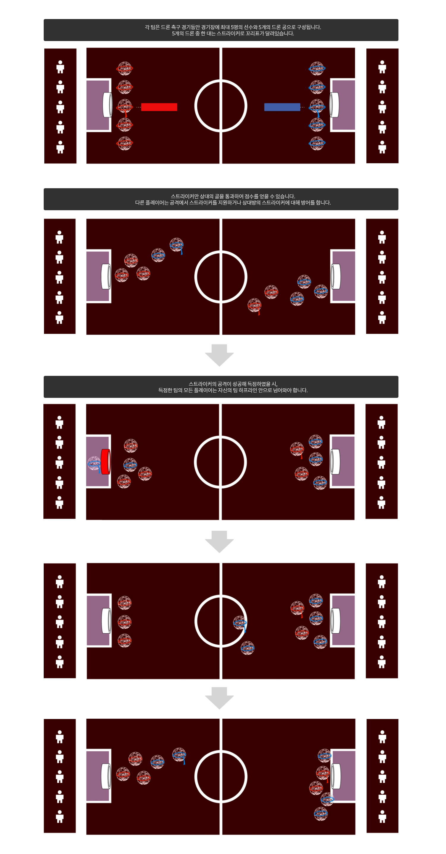 한 팀은 5대의 드론으로 구성되며 이 중 상대의 골을 통과하여 득점할 수 있는 드론은 스트라이커로 지정된 한 대뿐이다.